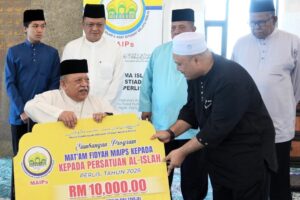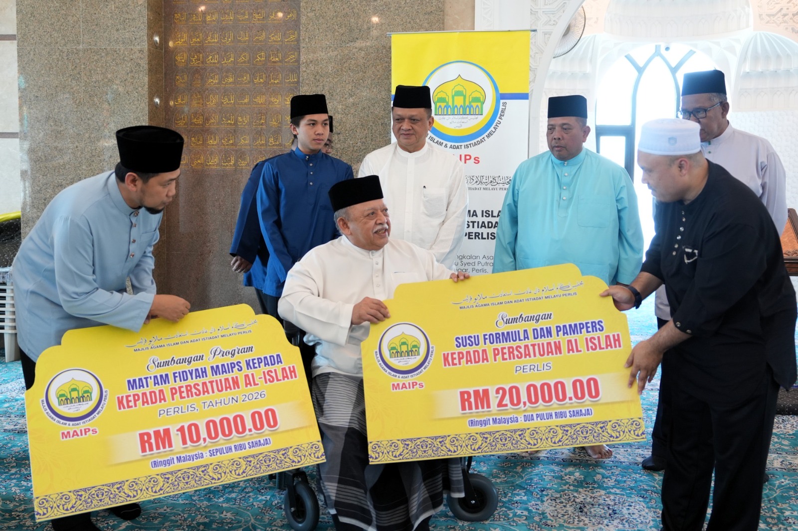 KUALA PERLIS, 2 Disember 2026 — Majlis Agama Islam dan Adat Istiadat Melayu Perlis (MAIPs) menyalurkan Sumbangan Mat’am Fidyah berjumlah RM10,000 kepada Persatuan Al-Islah Perlis, selain sumbangan Susu Formula dan Lampin Pakai Buang bernilai RM20,000 kepada persatuan sama, sebagai manifestasi keprihatinan MAIPs terhadap kebajikan golongan memerlukan, khususnya melibatkan penjagaan ibu dan kanak-kanak.