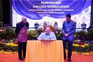 Majlis turut diserikan dengan keberangkatan Tuanku Syed Sirajuddin bagi menyempurnakan Pelancaran Buku Mewah bertajuk “Payung Kedaulatan: Menghargai Jasa DYMM Tuanku Canselor, USM”.
