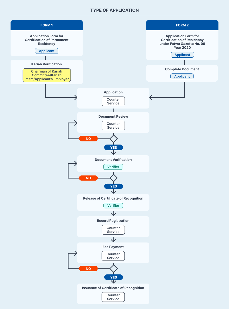 | 5 | Document Review Verification by the Chairman of Kariah Committee / Kariah Imam / Applicant’s Employer Copy of Identification Card | Document Review Receipts and Verification of Stay exceeding 5 days (if applicable) and Applicant’s statutory declaration Copy of Identification Card | Service Counter Staff |
