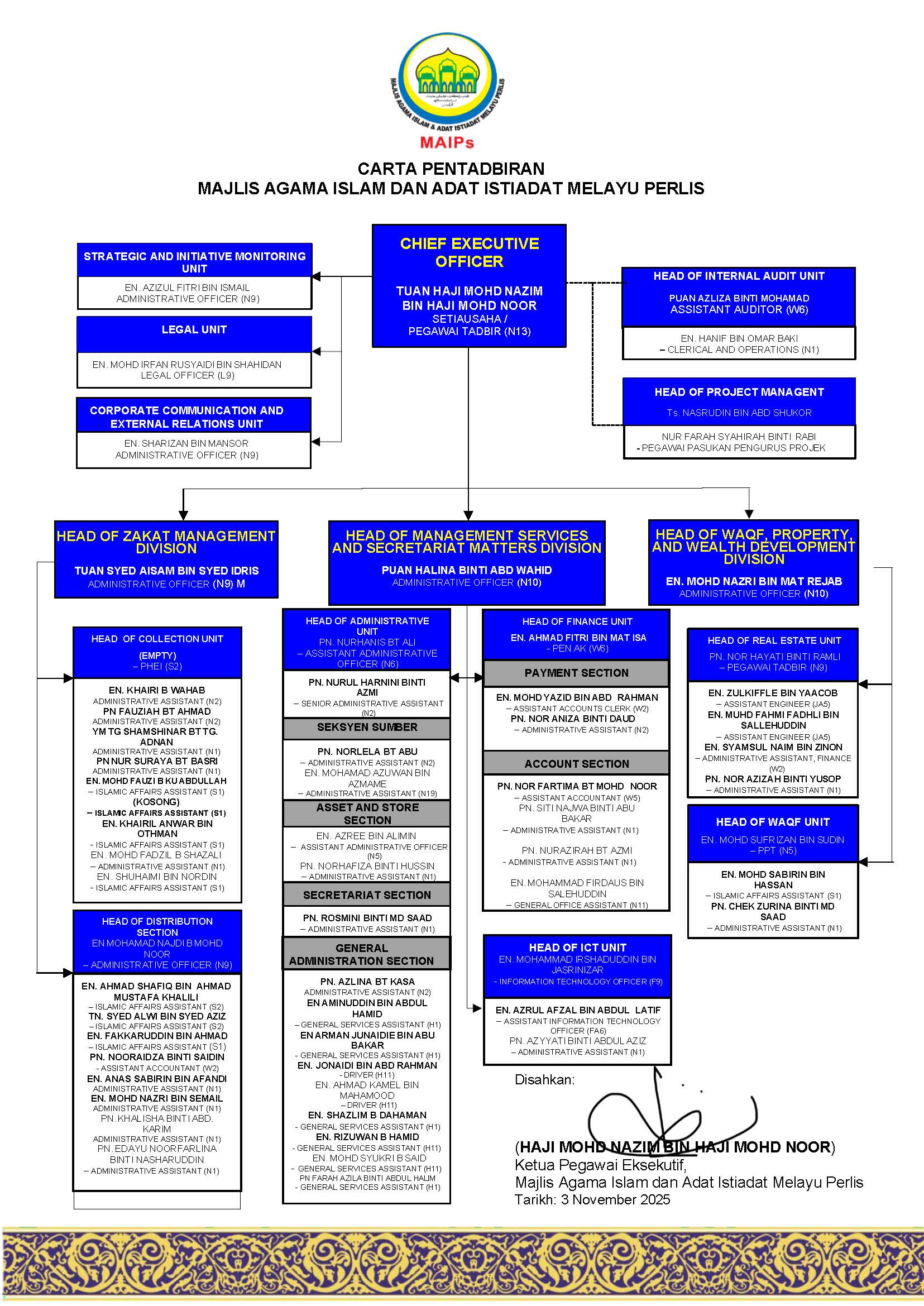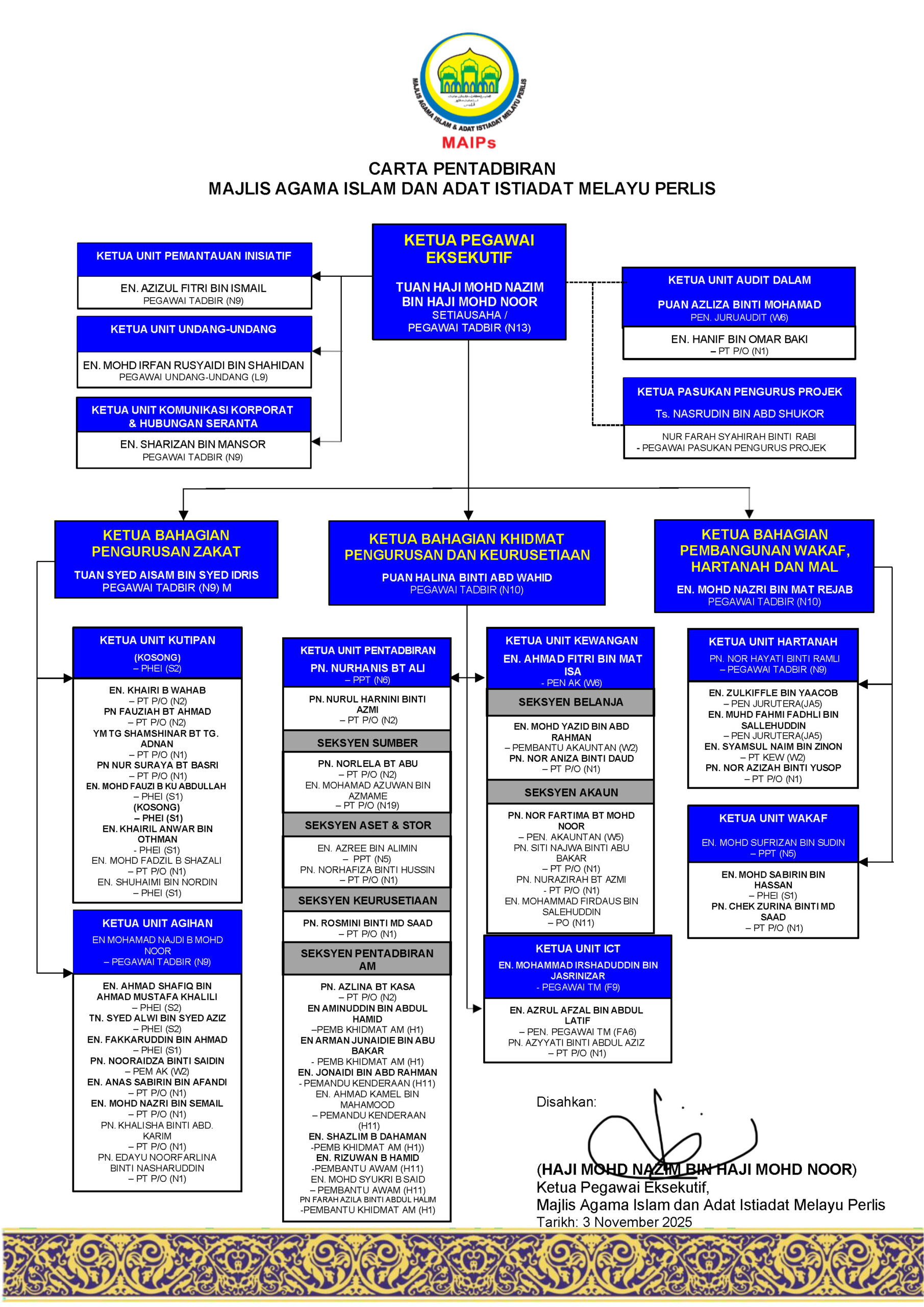 MAIPs merupakan institusi utama dalam pengurusan hal ehwal agama Islam dan adat istiadat Melayu di negeri Perlis. Pengurusan MAlPs dipimpin oleh Ketua Pegawai Eksekutif, YBrs. Tuan Haji Mohd Nazim bin Haji Mohd Noor, yang dibantu oleh beberapa unit dan bahagian yang memainkan peranan penting dalam melaksanakan tugas dan tanggungjawabnya.